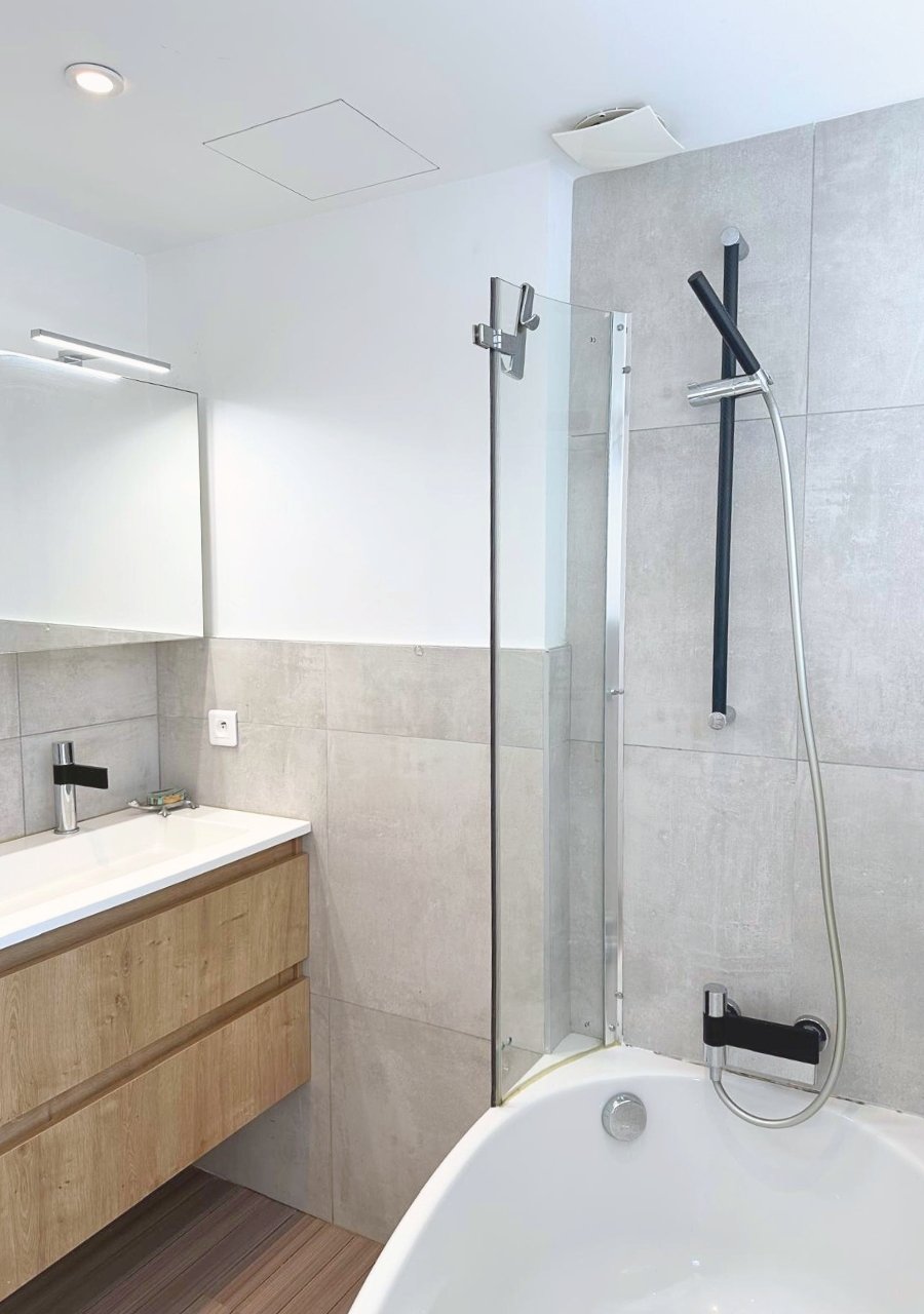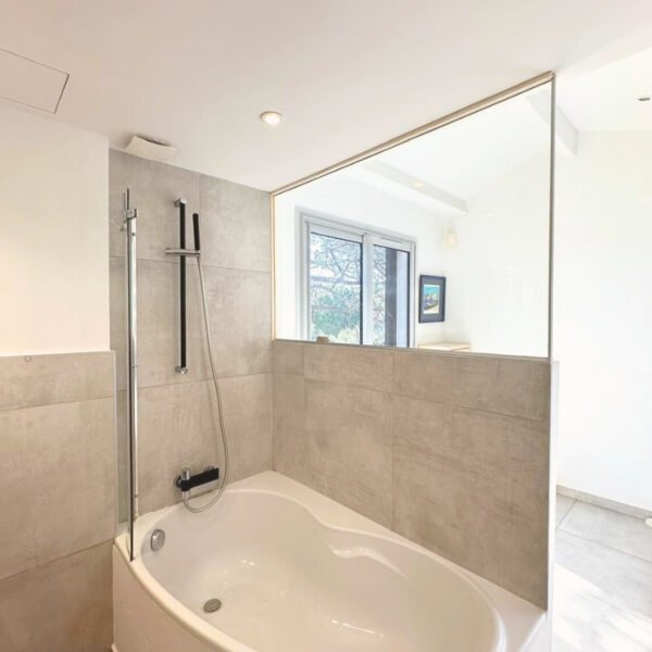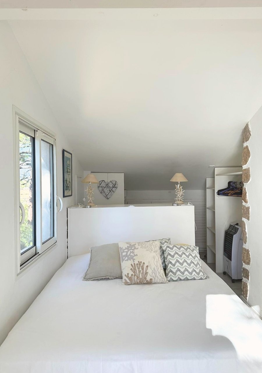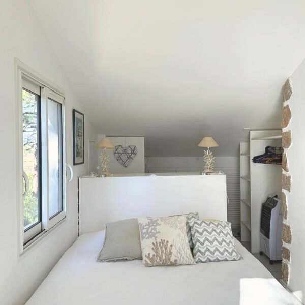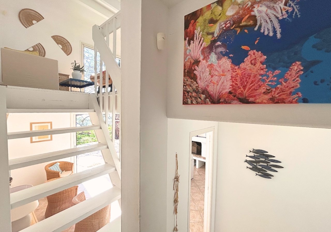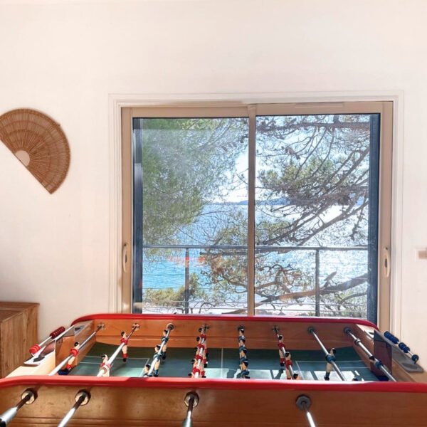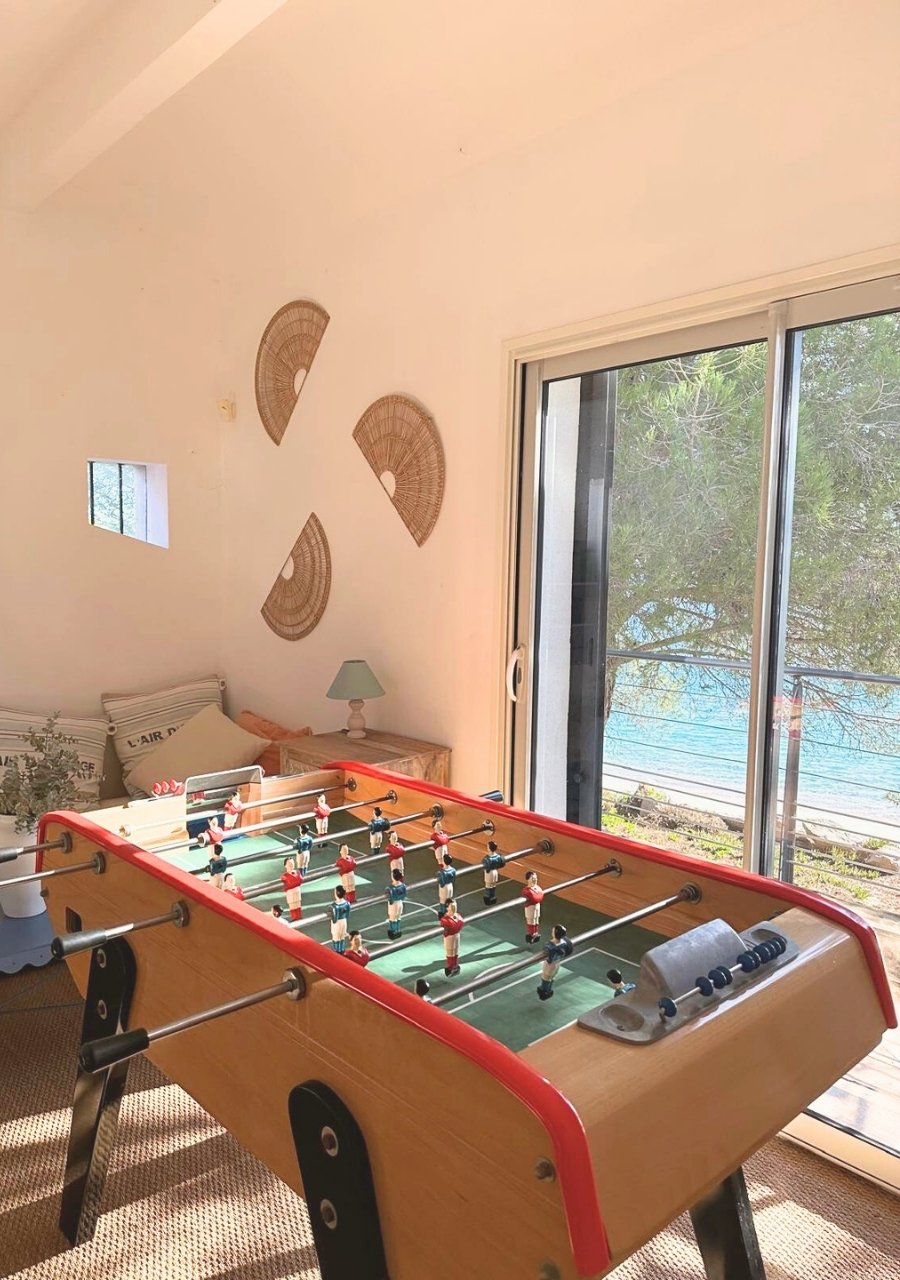 À l’étage, une mezzanine avec baby-foot et coin canapé précède la superbe suite parentale : lit double, salle de bain privative, baignoire, double vasque et WC ainsi qu’un dressing et terrasse avec vue mer imprenable.