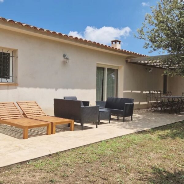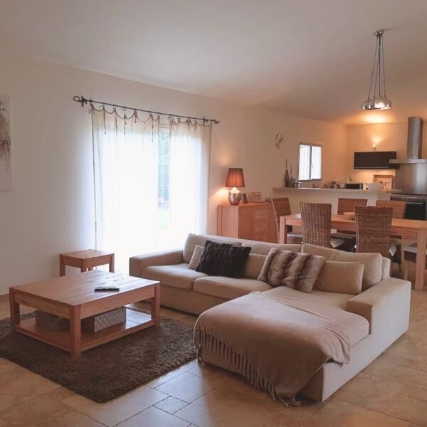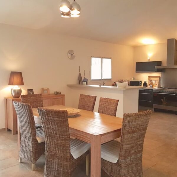 Spacieuse et lumineuse, la villa se compose d’un grand séjour avec salle à manger et cuisine ouverte entièrement équipée, ouvrant sur une agréable terrasse. Elle comprend également un cellier, des toilettes indépendantes, trois chambres confortables (dont une avec dressing) ainsi qu’une salle de bains avec baignoire, douche et WC.