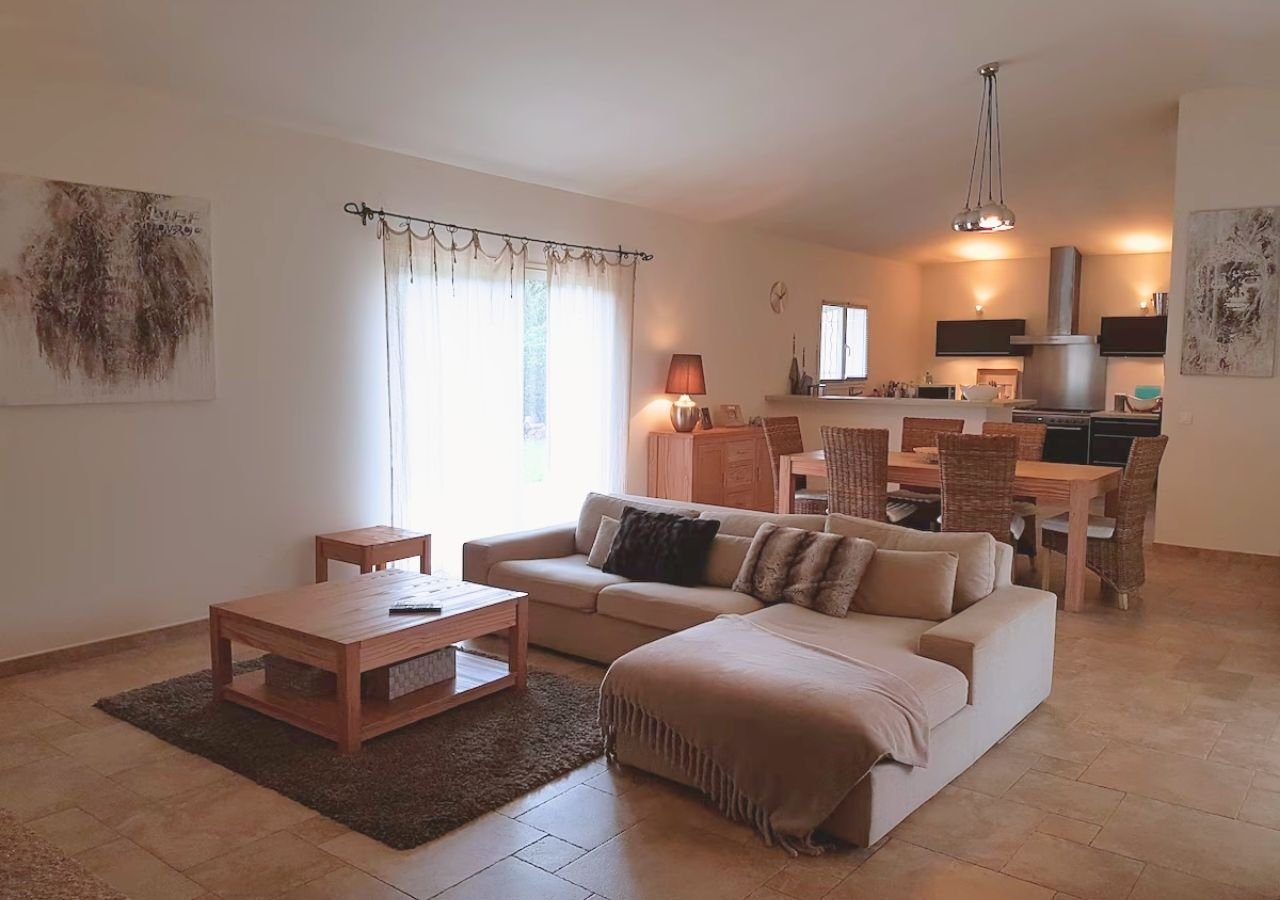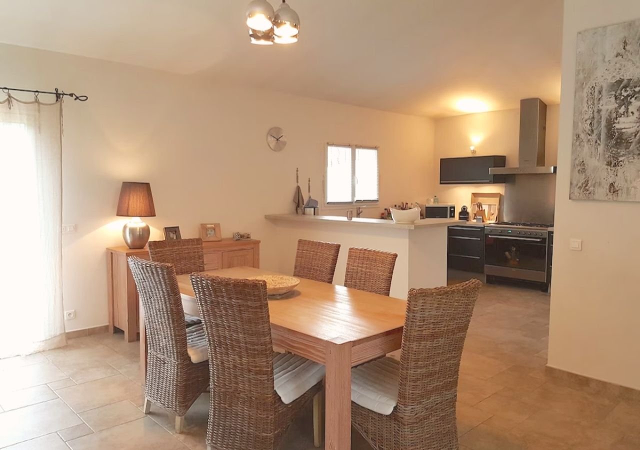 Spacieuse et lumineuse, la villa se compose d’un grand séjour avec salle à manger et cuisine ouverte entièrement équipée, ouvrant sur une agréable terrasse. Elle comprend également un cellier, des toilettes indépendantes, trois chambres confortables (dont une avec dressing) ainsi qu’une salle de bains avec baignoire, douche et WC.